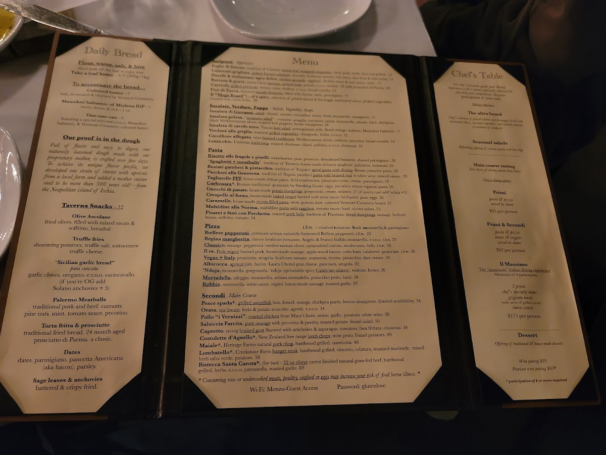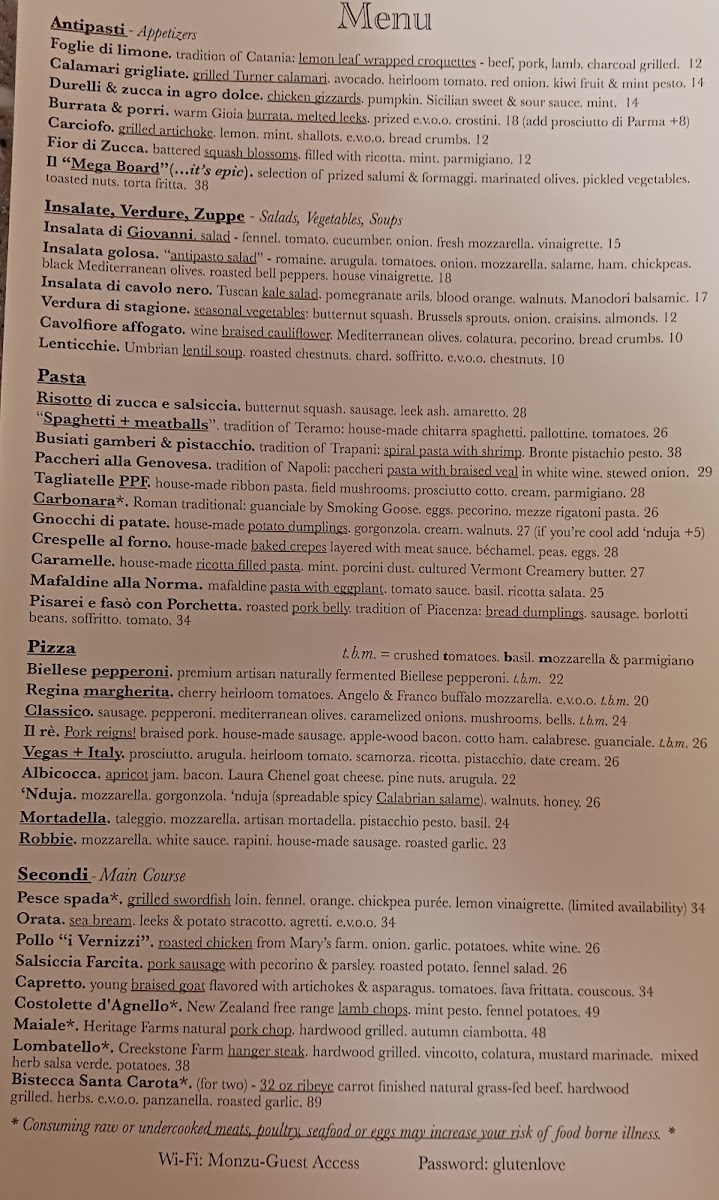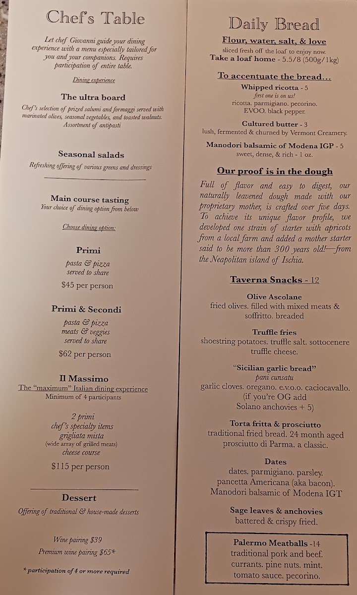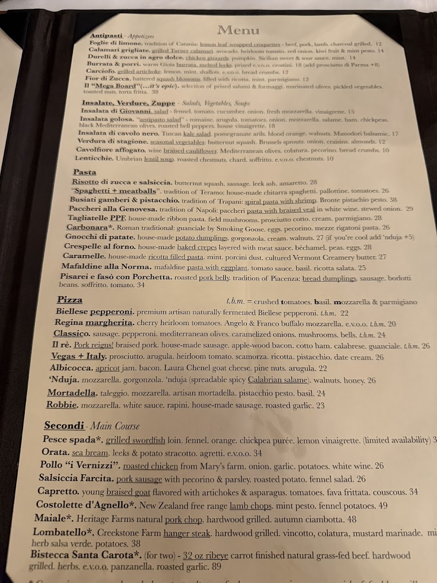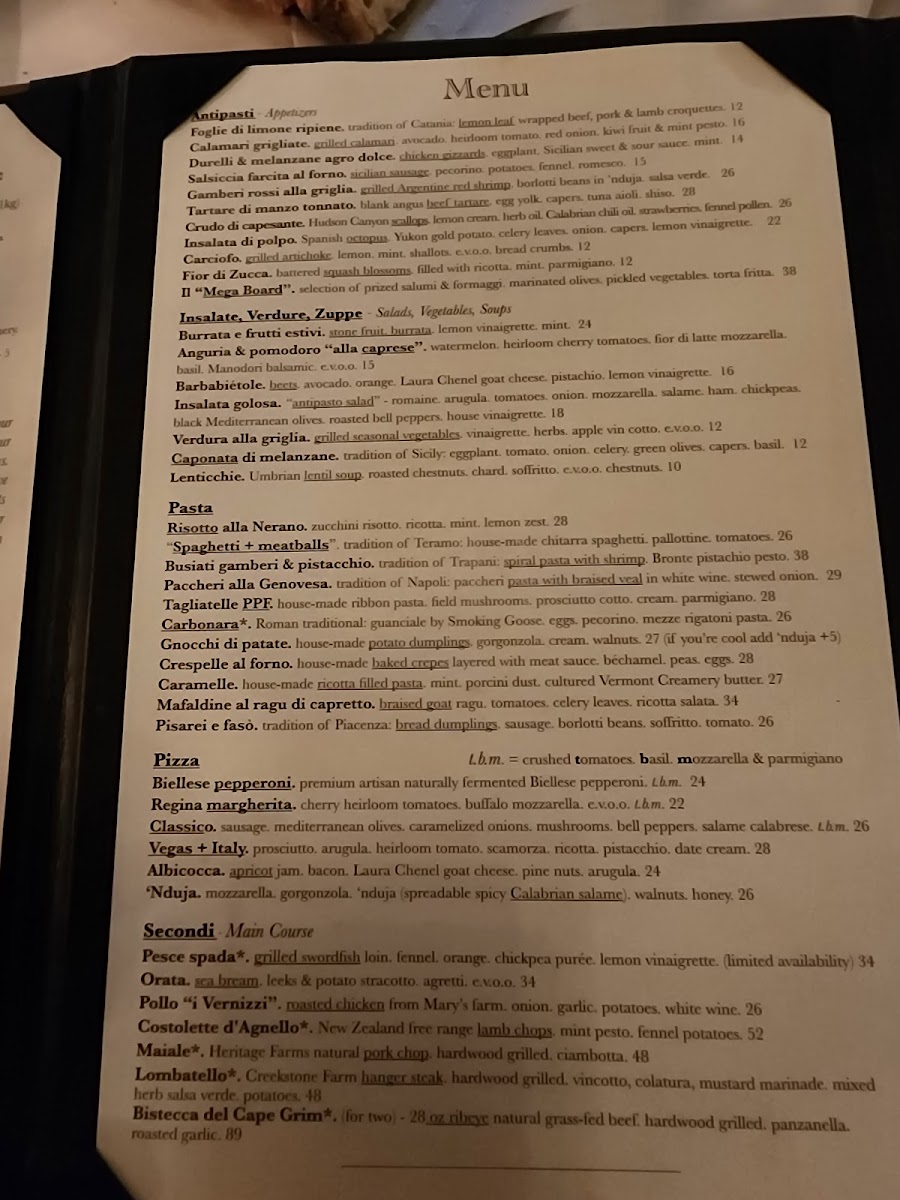 Popular Dishes: Indulge in their renowned Caramelle—housemade ricotta stuffed pasta with mint and porcini dust, gently enveloped in Vermont creamery butter for just $27. If you're a fan of hearty classics, the Spaghetti + Meatballs is a must-try, featuring traditional Teramo chitarra spaghetti paired with juicy pallottine and fresh tomatoes for $26.