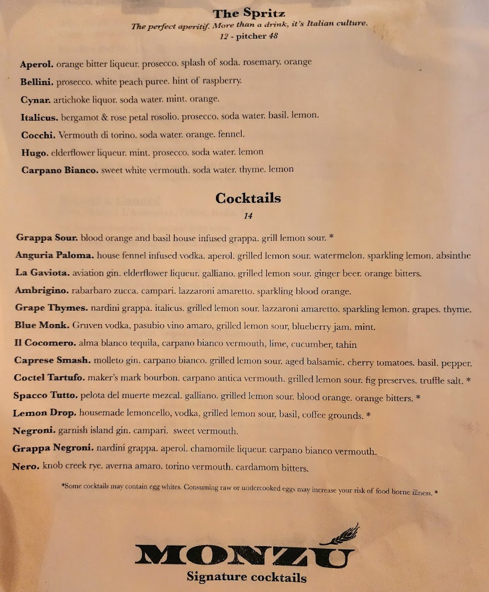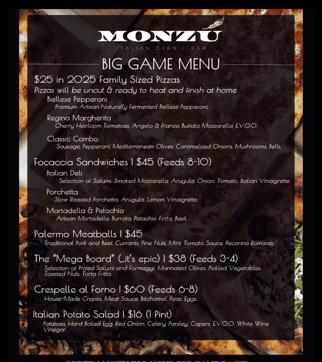 For pizza lovers, Monzú offers a creative range of options. The Small Albicocca Pizza brings an innovative blend of apricot jam, bacon, goat cheese, and pine nuts, ideal for those seeking a unique flavor explosion at $24. Alternatively, the Small Classic Combo Pizza—brimming with sausage, pepperoni, Mediterranean olives, and caramelized onions—offers a delightful classic taste at $24, perfect for sharing with loved ones.